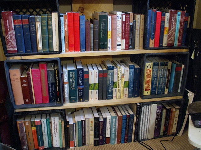 This is my travel shelf. Milk crates and boards. My wife and I have lived in four places in the past 18 months and this is the most practical way to always have shelving. Now I repeated the middle shelf, but from top to bottom: books I’m reading/can’t fit else where, Monographs and commentaries from Matthew through Romans (Cranfield), Romans (Moo) through 1-3 John by Marshall. I don’t have print books covering the NT or OT. Note the middle of the middle shelf is nearly all on Ephesians. Of particular note is the small brown book directly to the right of  Harold Hoehner’s giant tome. That’s an 1856 first edition of Charles Hodge’s commentary on Ephesians. Finally the bottom two shelves are Old Testament and then hermeneutics. The spiral notebooks are a prepub version of Dr. Bateman’s Workbook for Intermediate Greek. Beside them are a few more random books, Dead sea scrolls, Jewish Lit Between the Bible and the Mishnah…etc.
