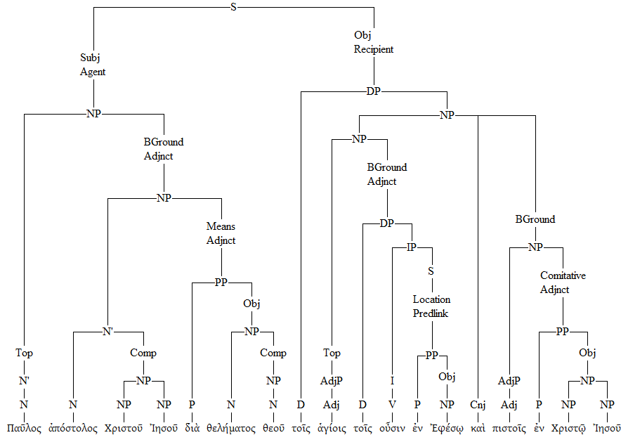 The main issue I struggled with in Ephesians 1:1 is the fact that this is a verbless clause, but as an epistolary introduction, its not a typical verbless clause. That is, the non-subject phrase cannot be considered a predicate since it predicates nothing about the subject. Functionally its more like an indirect object and semantically its a recipient. For that reason, I have not labeled it as “Predicate Link” as I described previously on Ephesians 1:3-14 for verbless clauses. This time around, I’m trying to consistently represent semantic roles on various phrases as well. The rest of the labels I described previously have stayed the same.*
