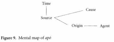 having analyzed the use and the semantic evolution of both ek and apo, we can now finish the discussion started in 3.2. the two prepositions have quite distinct meanings in homer, where the more specific meaning of ek appears to make it more suitable for various types of extension outside the spatial domain: so ek is found in Time and sometimes in Cause expressions, it is the standard way to denote Origin, and its occurrences in Agent expressions is also significant. On the spatial plane too, the two prepositions appear to overlap only partially, since landmarks that can be conceived as containers normally take ek.