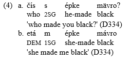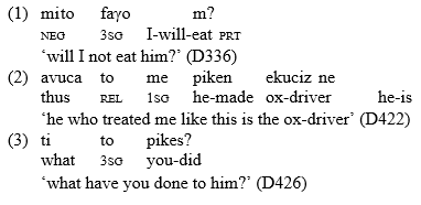 Janse uses the term “echo structures” for some of these. These involve the attachment of the clitic pronoun to a fronted constituent that takes argument focus.[1] The term “echo” comes from the fact that many of these follow from one of Janse’s syntactic constraints above: clauses where the interrogative pronoun attracts the clitic pronoun. This is seen in the following examples: