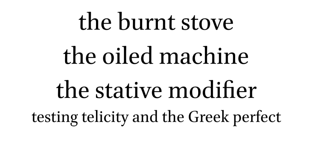 But one of the most interesting tests, to me, for the semantics of the Greek perfect is a fairly recent addition to the literature. It is not original to Vendler (1957). It is the stative modifier test and it functions as evidence that a predicate is telic. That is, the predicate involves a change of state, one participant in the clause is different than it was when it started. If we collect all the tested clauses from above, we can see this more easily.