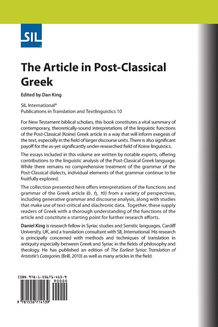 SIL International has published The Article in Post-Classical Greek, edited by Daniel King, on September 9, 2019 in the Publications in Translation and Textlinguistics monograph series.