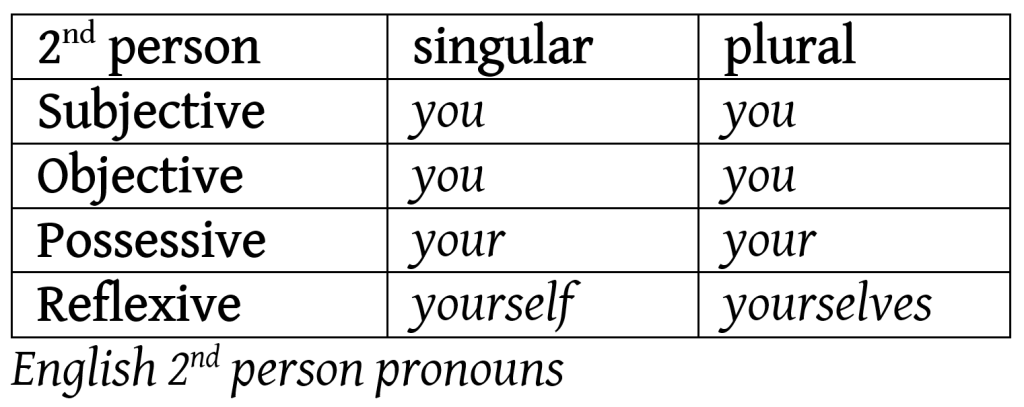* Though, note that in the Southern United States there is also y’all and all y’all, which make additional grammatical distinctions.
