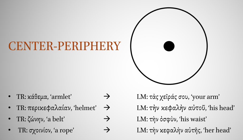 Of course, not all instances of περί AREA expressions are so hierarchical. That’s because category structures and frames do not need to be activated with a superordinate entity to be activated. There’s a common refrain in frame semantics: Activate Part of a Frame, Activate the Whole Frame. That’s because frames are cognitive scripts when you initiate a script that everyone knows: then the speaker and hearer then can rely on shared information about that script in their communication and interaction (cf. Fillmore 2003; Fillmore & Atkins 1992). This is a concept I discussed in my short note on how definite articles work—that’s frame semantic at work.